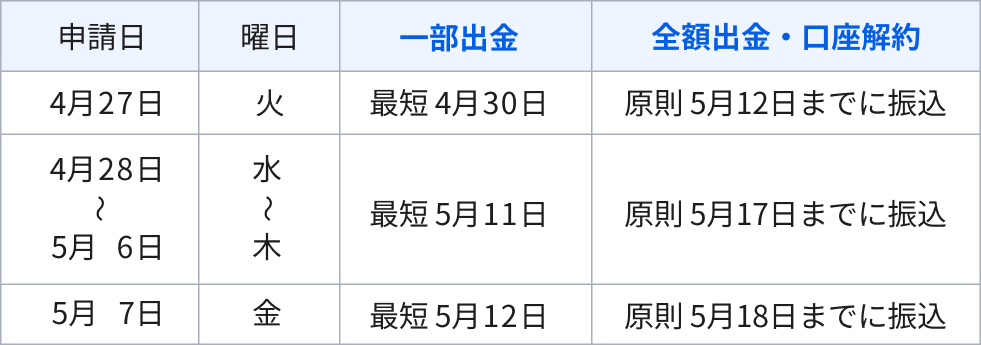※出金、口座解約の申請は原則15時までに申請した場合。15時以降に一部出金、口座解約の申請をした場合は、原則、翌営業日の扱いになります。
