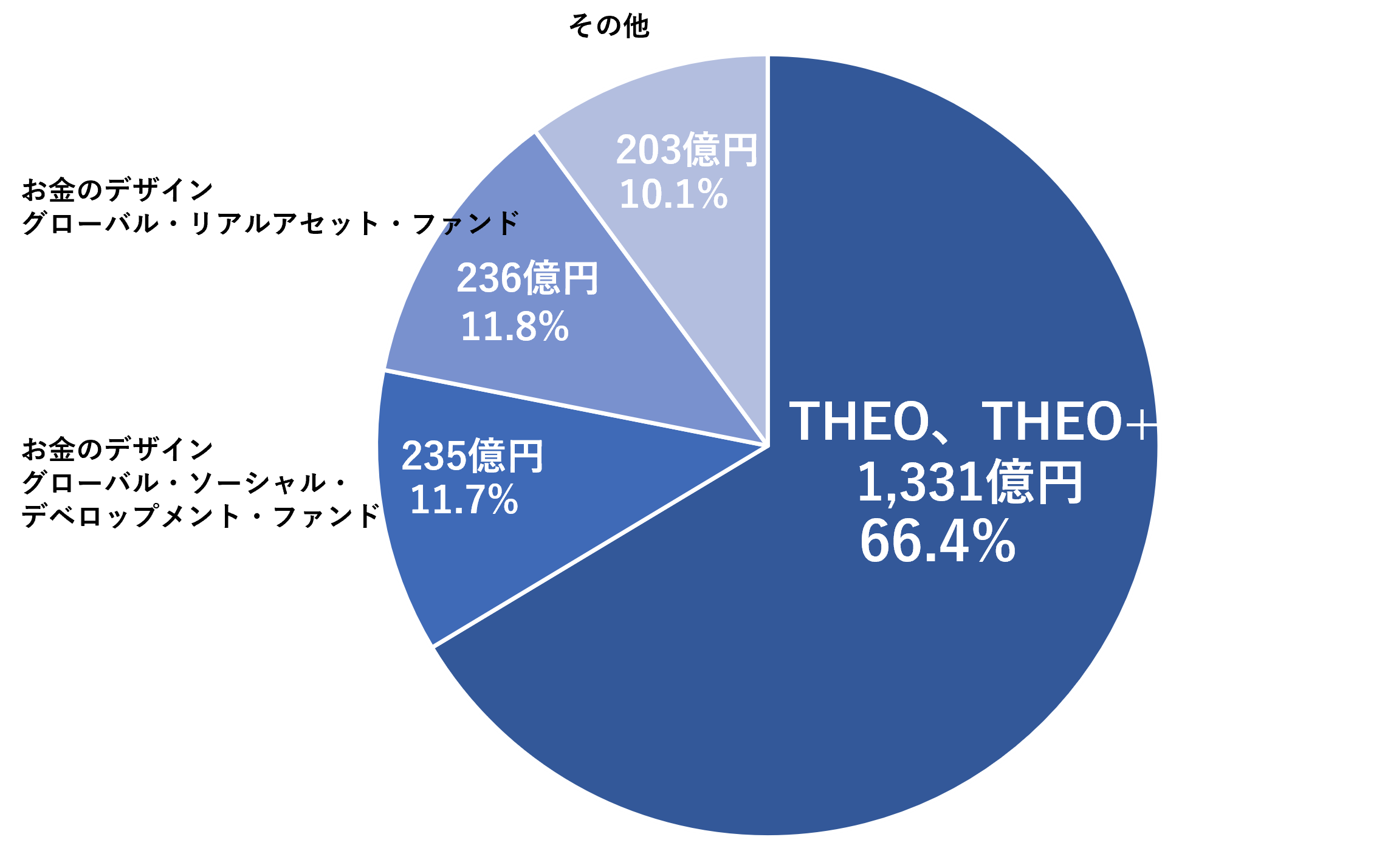 運用資産合計の内訳は、THEOシリーズ(THEO+を含む)の1,331億円、お金のデザイン・グローバル・ソーシャル・ デベロップメント・ファンド、お金のデザイン・グローバル・リアルアセット・ファンド等の投資信託の675億円の合計2,006億円です。(2022年3月29日時点)