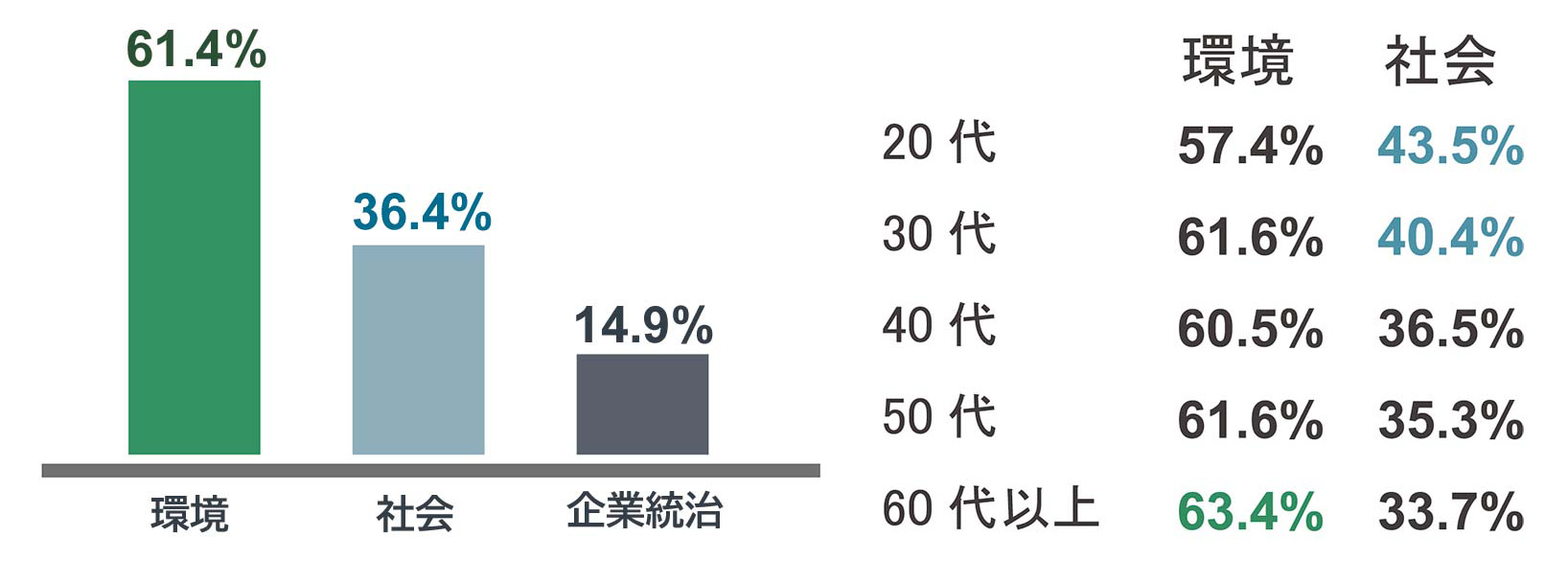 ESG(環境、社会、企業統治)の中で興味がある分野を聞くと、61.4%が環境を選択しました。環境への関心は60代以上が特に高く、社会への関心は20代が高いなど、世代による関心分野の違いも明らかになりました。