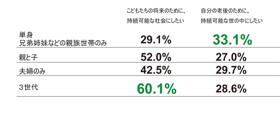 また、SDGsにおいても、こどもたちや自身の将来のために持続可能な社会にしたいと考える方の割合は高く、特に3世代同居世帯においては単身世代に比べ約2倍となりました。