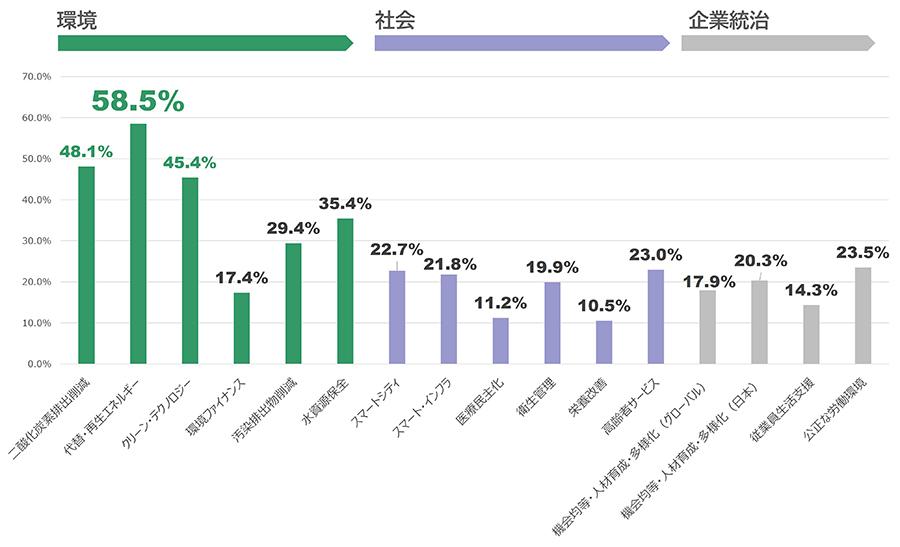また、当社が提示した16個のESGのテーマについて、一番関心が高いテーマは「代替・再生エネルギーや二酸化炭素排出削減」となりました。