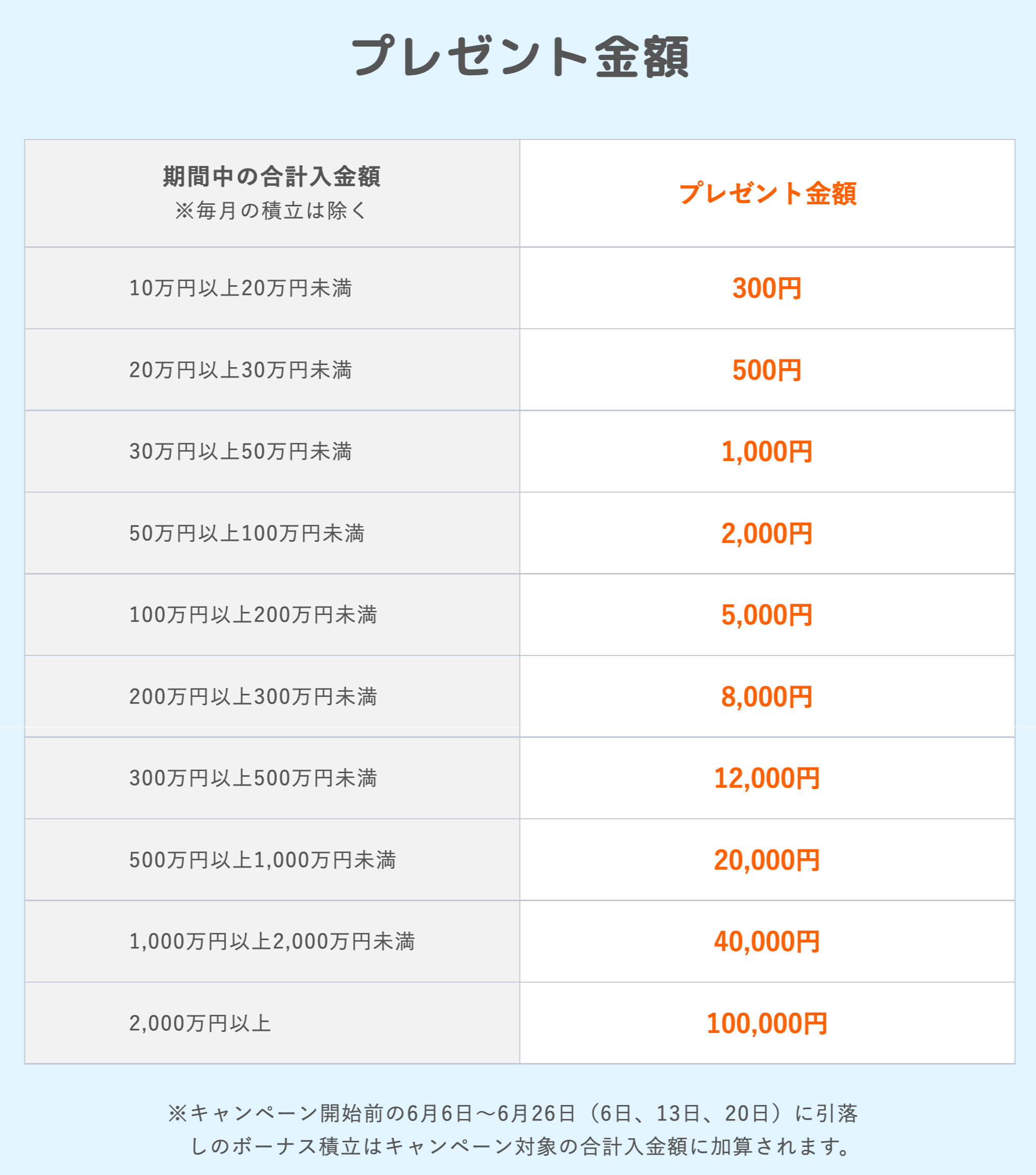 ※キャンペーン開始前の6月6日~6月26日(6日、13日、20日)に引落しのボーナス積立はキャンペーン対象の合計入金額に加算されます。