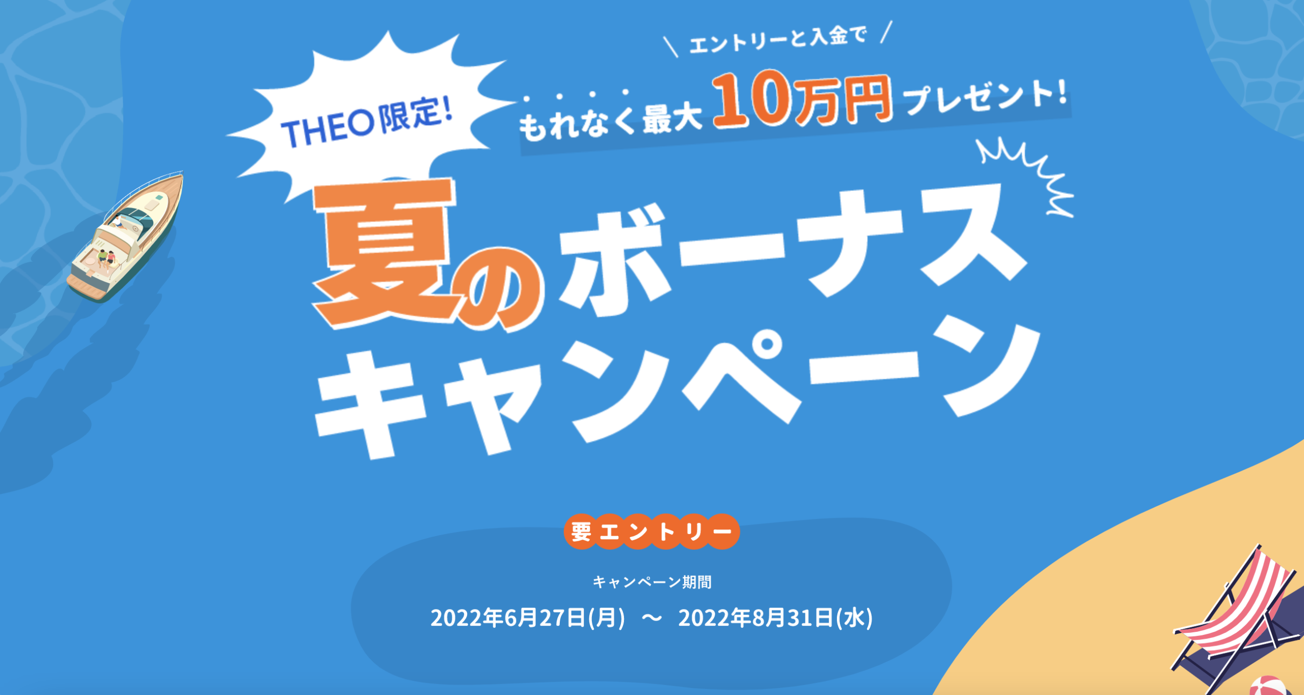 先進的なデジタル資産運用を提供する株式会社お金のデザイン(本社:東京都千代田区、代表取締役社長:山辺 僚一)は、2022年6月27日(月)より、キャンペーンページからエントリーされた方限定で、入金額に応じてもれなく最大10万円のプレゼントがもらえる「THEO夏のボーナスキャンペーン」を実施いたします。
