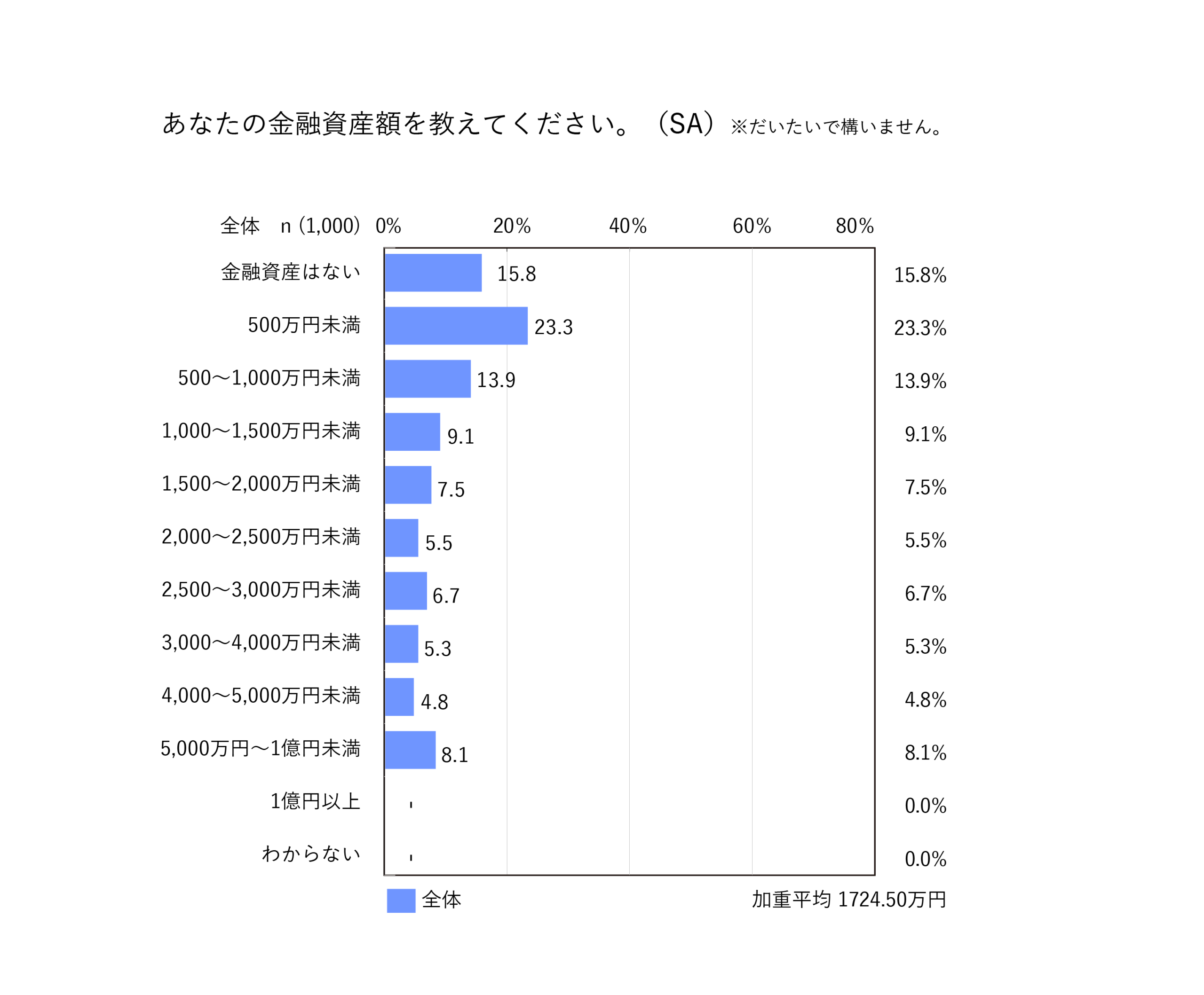 「金融資産はない」、「500万円未満」、「500~1,000万円未満」の総計は53.0%。1億円未満の資産を有する全体平均は1,724.5万円となり、金融庁が発表※1した「人生100年時代の老後資金2,000万」に満たない結果となった。