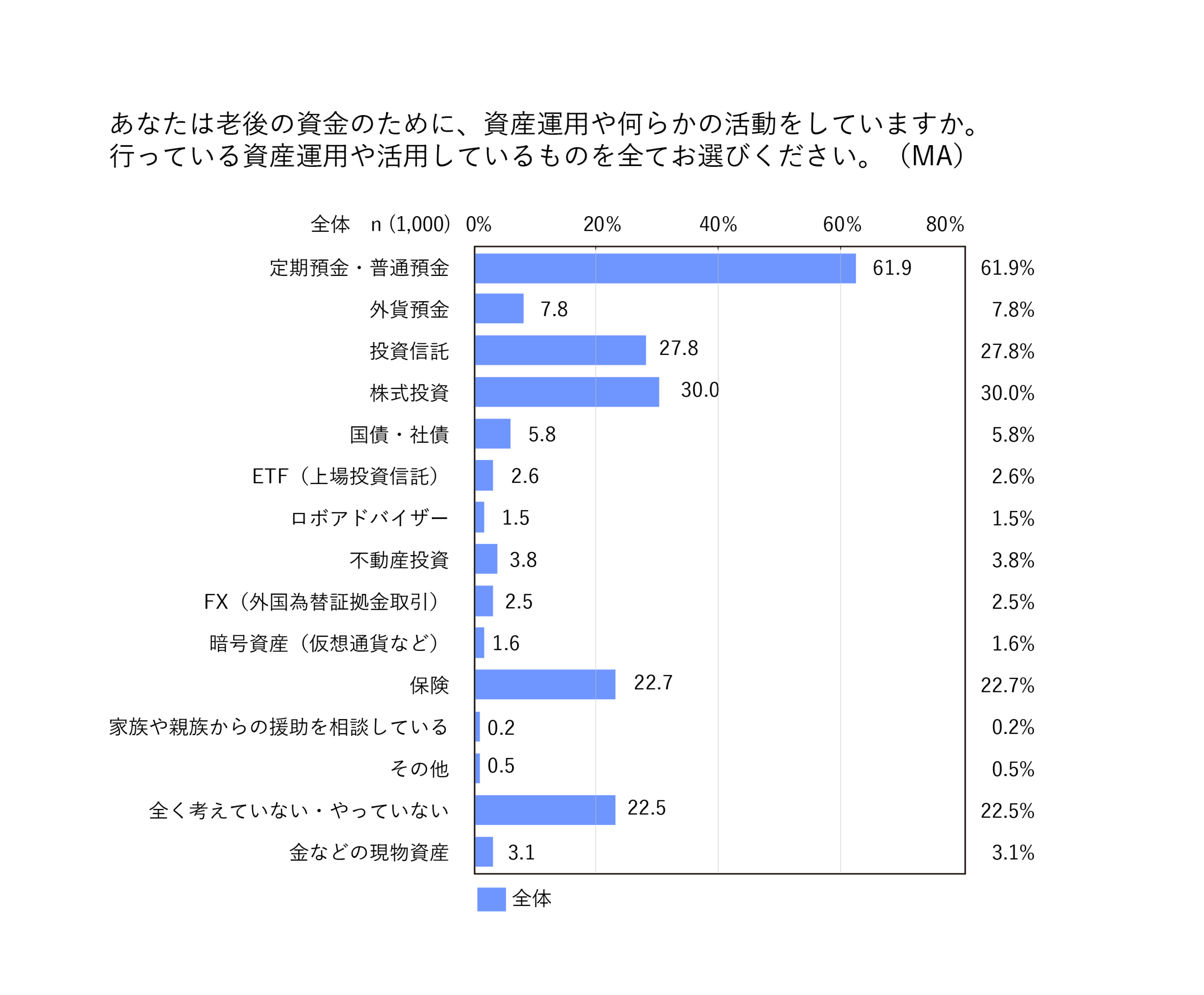 ●老後老後の資金のために活用しているものは、「定期預金・普通預金」が約6割とやや突出。「投資信託」「株式投資」「国債・社債」「ETF(上場投資信託)」「ロボアドバイザー」など投資の活用は約4割に留まった。