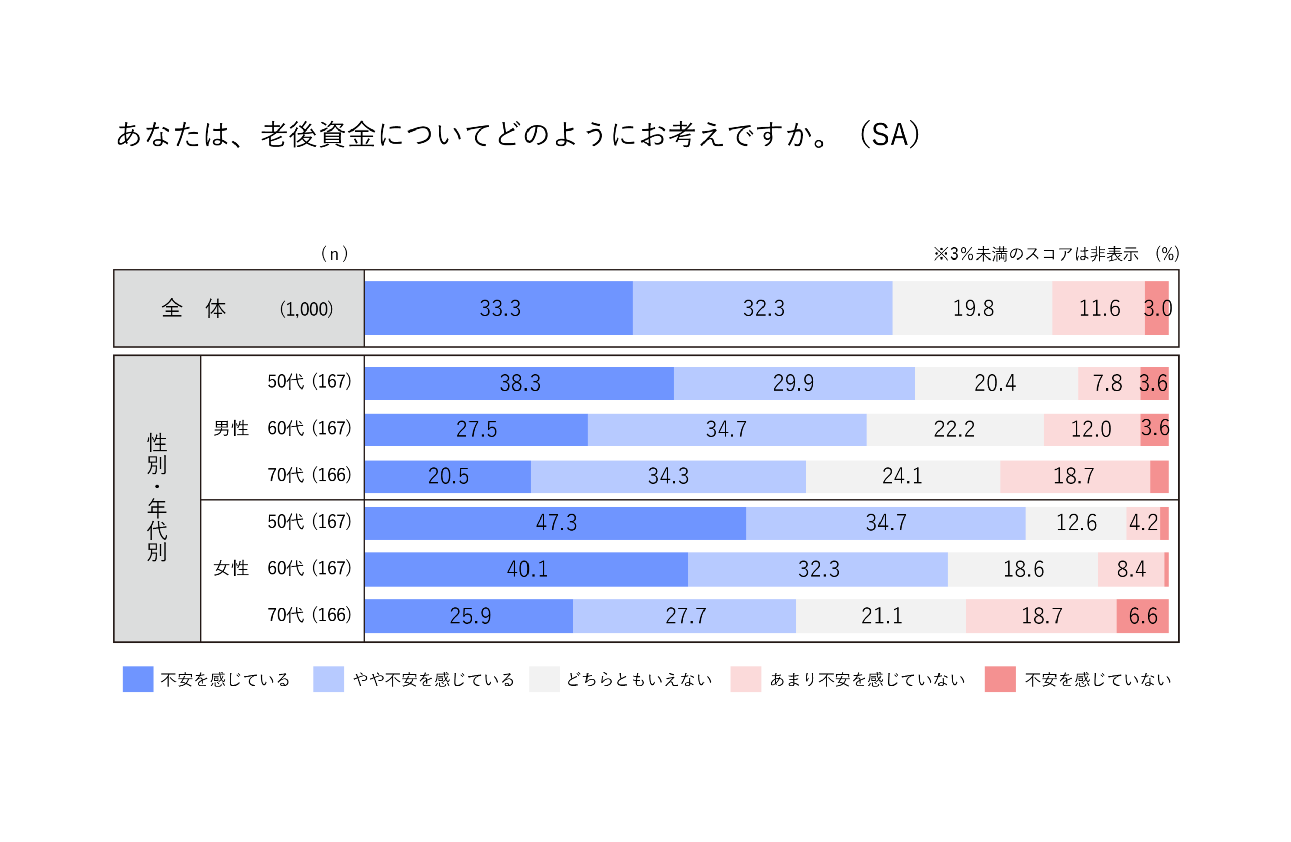 (調査レポート)「老後資金の不安」65%以上、年代が若いほど不安傾向に。 「介護・医療費負担」「何歳まで生きるかわからない」など、 長寿に伴う「資産の使い切り」リスク恐れる。