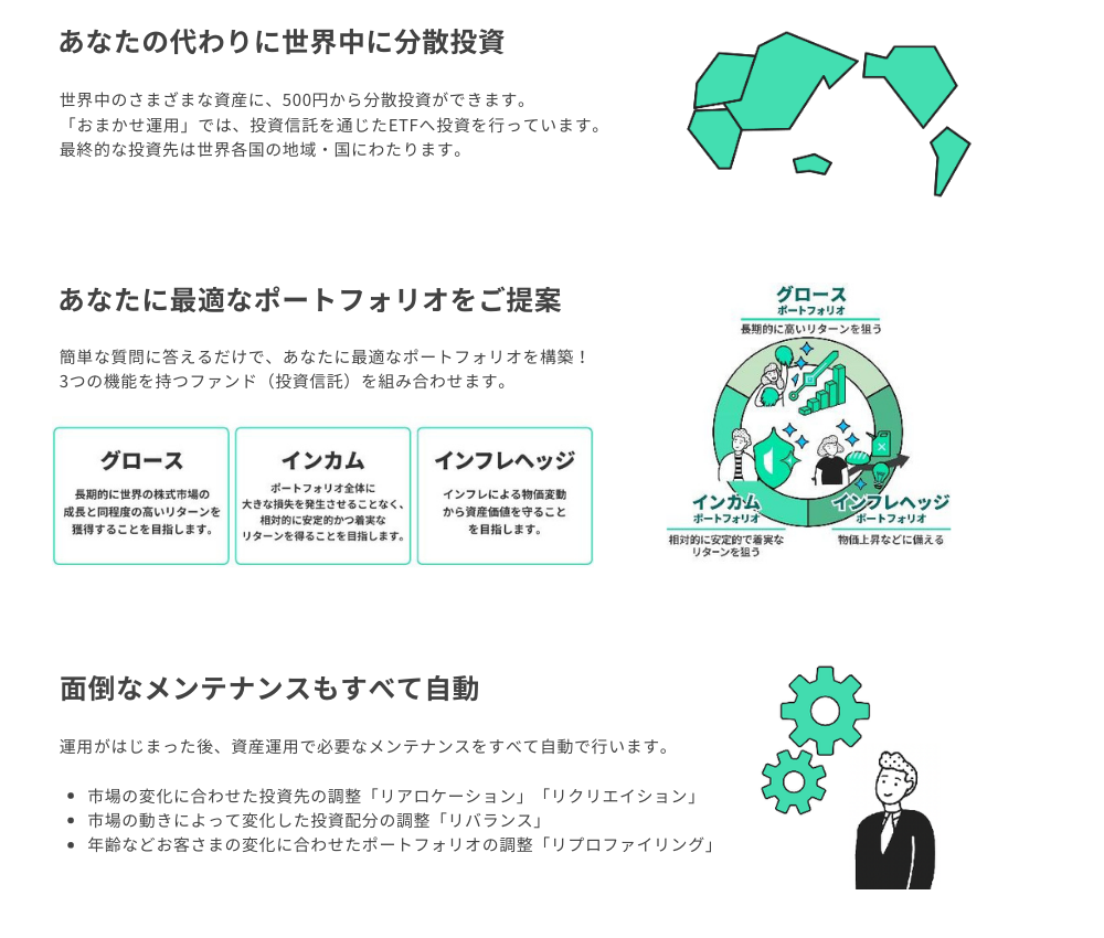 これから投資を始められる方や、興味があるけれど一歩踏み出せない方にも手軽にご利用いただけるよう、「おまかせ運用」では、500円から世界中のさまざま資産に分散投資ができます。