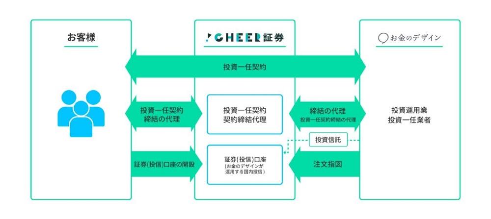 お金のデザインは、当該投資一任契約の締結の代理・媒介に係る委託契約をCHEER証券と締結しており、CHEER証券がお客さまとお金のデザインとの投資一任契約締結の代理・媒介を行います。
