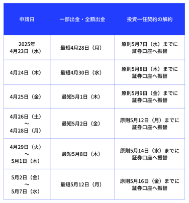 ※一部出金、全額出金、口座解約の申請は原則15時までに申請した場合。15時以降に一部出金、投資一任契約の解約申請をした場合は、原則翌営業日の扱いになります。
