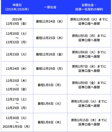 入金・出金・口座解約などの各種申請は、通常どおり、行うことができますが、出金・解約の申請日によっては、証券口座への振替が年明けになる場合がございます。年内の資金の受取をご希望の場合は、余裕をもって申請していただきますようお願いいたします。お客さまからのお申し出により振込日を早めることはできませんので、あらかじめご了承ください。