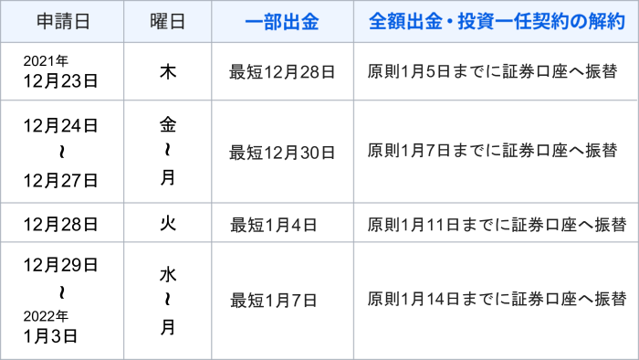 出金・解約の申請日によっては、証券口座への振替が年明けになる場合がございます。