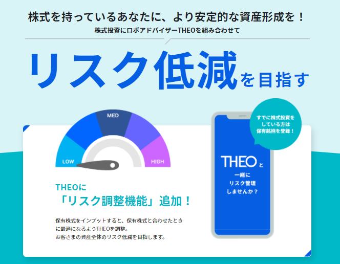 今回リスク調整機能が加わり、お客さまがすでにお持ちの日本株式を考慮したうえで、THEOのポートフォリオを最適化し、お客さまの資産運用におけるリスク低減をサポートできるロボアドバイザーに進化しました。