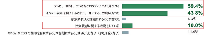 SDGsやESGがどのようなものであるかについては、十分に情報が得られる状況になりつつあり、今後は、実際に社会貢献に関する活動に参加する方法・手段などの情報が得られる環境となっていくことで、関心の高さが実際の行動につながると推測されます。