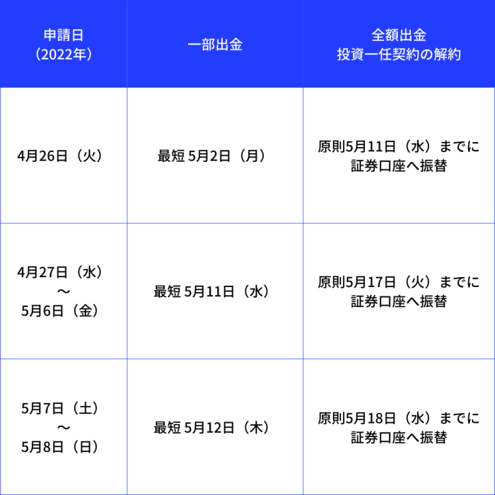 ※一部出金、全額出金、口座解約の申請は原則15時までに申請した場合。15時以降に一部出金、投資一任契約の解約申請をした場合は、原則翌営業日の扱いになります。