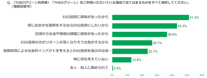 THEOグリーンについて当社で行ったアンケートでは、「ESGに興味があったから」という理由でご利用いただいているお客さまが全体の5割を超えました。これは本機能が、ESG投資に興味はあるが始めかたがわからないという方にも、具体的な投資先の選定などを自分で行う必要がなく、手軽にESG投資を始められるツールとして認知され、ご利用いただくことができた結果であると考えております。
