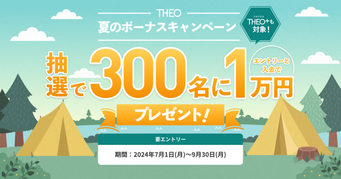 先進的なデジタル資産運用を提供する株式会社お金のデザイン(本社:東京都千代田区、代表取締役社長:伴 雄司 )は、2024年7月1日(月)より、キャンペーンページからエントリーされた方限定で、入金額に応じて抽選で300名の方に1万円をプレゼントする「THEO[テオ]夏のボーナスキャンペーン」を実施いたします。
